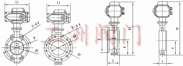 電動(dòng)對(duì)夾式蝶閥外形尺寸  |  公稱(chēng)通徑DN  | L  | H1  | H  | D1  | Z-φd  | D  | L1  |  50  | 43  | 452  | 80/112  | 120/125  | 4-18  | 165  | 208  |  65  | 46  | 475  | 88/115  | 136/145  | 4-18  | 185  | 208  |  80  | 46/49  | 516  | 96/120  | 160/  | 8-18  | 200  | 208  |  100  | 52/56  | 551  | 115/140  | 185  | 8-18  | 220  | 208  |  125  | 56/64  | 566  | 128/170  | 210  | 8-18  | 220  | 208  |  150  | 56/70  | 606  | 140/180  | 240  | 8-22  | 285  | 256  |  200  | 60/76  | 731  | 175/210  | 295  | 8-22  | 340  | 256  |  250  | 68/76  | 778  | 202/240  | 355  | 12-22  | 395/405  | 256  |  300  | 78/83  | 830  | 242/290  | 410  | 12-22  | 445/460  | 256  |  350  | 78/92  | 996  | 266/320  | 470  | 16-22  | 505-520  | 346  |  400  | 102  | 1058  | 298/350  | 515/525  | 16-26  | 565/580  | 346  |