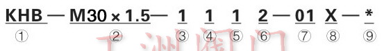 ① 系列代號:KHB(BKH)系列、KHM(MKH)系列 ② 連接代號:M** 、G** 、 **LR 、**SR、PT**、NPT** ③ 閥體材料:1-鋼、2-不銹鋼 ④ 球體材料:1-鋼、2-黃銅、3-不銹鋼 ⑤ 工作溫度:1、-25~+100℃ 2、-30~+170℃  ⑥ 其他密封:2-丁晴橡膠、4-氟橡膠 ⑦ 手柄形式:01-鋁質直柄02-鋁質曲柄03-鑄鋅直柄04-鑄鋅曲柄05-鋼質直柄06-鋼質曲柄09-不帶手柄 ⑧ 設計序號:由生產商定 ⑨ 表面處理:空白-磷化、G-電鍍黃鋅