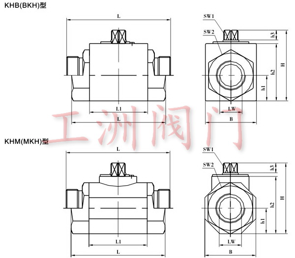 簡略型號  | PN(bar)  | DN  | LW  | RA  | d1  | i  | L  | L1  | B  | H  | h1  | h2  | h3  | SW1  | SW2  |  KHB-M16×1.5  | 500  | 06  | 06  | 11  | M16×1.5  | 11  | 69  | 40  | 26  | 45  | 13.5  | 33  | 8  | 09  | 22  |  KHB-M22×1.5  | 500  | 08  | 08  | 16  | M22×1.5  | 12  | 76  | 42  | 32  | 49  | 16  | 36  | 10  | 09  | 27  |  KHB-M27×1.5  | 500  | 10  | 10  | 20  | M27×1.5  | 12  | 76  | 42  | 32  | 49  | 16  | 36  | 10  | 09  | 27  |  KHB-M30×1.5  | 400  | 16  | 15  | 24  | M30×1.5  | 13  | 84  | 48  | 38  | 61  | 19  | 45  | 11  | 09  | 32  |  KHB-M36×2  | 315  | 20  | 20  | 30  | M36×2  | 15  | 103  | 60  | 48  | 70  | 25  | 55  | 11  | 12  | 41  |  KHB-M42×2  | 315  | 25  | 23  | 35  | M42×2  | 18  | 116  | 65  | 57  | 79  | 28.5  | 64  | 11  | 12  | 50  |  KHB-M52×2  | 315  | 32  | 32  | 40  | M52×2  | 20  | 149  | 84  | 75  | 101  | 37.5  | 84  | 12  | 14  | 60  |  KHB-M60×2  | 315  | 40  | 38  | 45  | M60×2  | 22  | 174  | 91  | 85  | 112  | 42.5  | 95  | 12  | 14  | 70  |