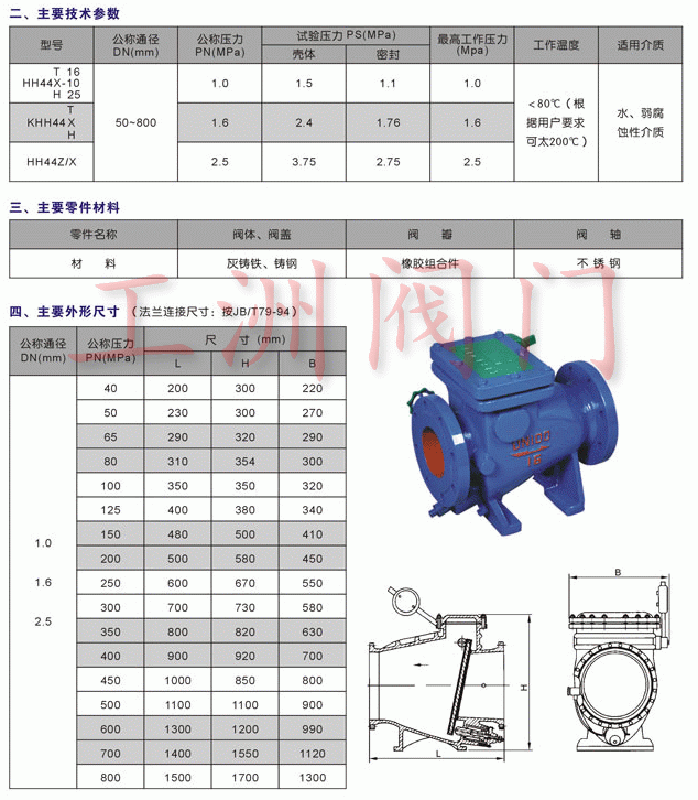 一、微阻緩閉止回閥結構特點: HH44X微阻緩閉止回閥用于給排水管道,安裝在是水泵出口處用來防止介質逆流和消除破環性水錘,并能有效地減少閥門關閉水錘壓力,可保障官網安全運行,它具有閥瓣輕、開度大、節電效果顯著,流體阻力小,水錘消除機構設計新穎,密封性能穩定可靠、耐磨損、使用壽命長、運行平穩、無振動、無噪聲等特點。 ? 主要零件材質如下: 零件名稱  | 材質  |  閥體  | 鑄鐵、鑄鋼、不銹鋼  |  閥蓋  | 鑄鐵、鑄鋼、不銹鋼  |  閥瓣  | 碳鋼、不銹鋼+丁腈橡膠  |  閥桿、活塞  | 不銹鋼  |