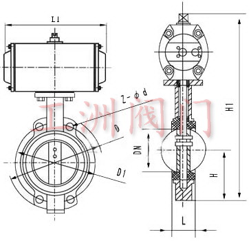 注:括號內數值為帶定位器的允許壓差。  ???????????????????????   ZSRW、ZSCW氣動活塞調節蝶閥????????????????????????? ?ZSRW、ZSCW氣動活塞調節蝶閥結構圖公稱通徑DN  | 結構長度 (標準值)  | 連接尺寸  |  L  | H  | H1  | PN0.6MPa  | PN1.0MPa  |  毫米  | 英寸  | 法蘭式  | 對夾式  | D  | D1  | Z-d  | D  | D2  | Z-d  |  50  | 2  | 108  | 43  | 100  | 400  | 140  | 110  | 4--14  | 165  | 125  | 4--18  |  65  | 21/2  | 112  | 46  | 115  | 420  | 160  | 130  | 4--14  | 185  | 145  | 4--18  |  80  | 3  | 114  | 49  | 120  | 138  | 190  | 150  | 4--18  | 200  | 160  | 8-18  |  100  | 4  | 127  | 56  | 130  | 524  | 210  | 170  | 4--18  | 220  | 180  | 8-18  |  125  | 5  | 140  | 64  | 150  | 570  | 240  | 200  | 8-18  | 250  | 210  | 8-18  |  150  | 6  | 140  | 70  | 170  | 743  | 265  | 225  | 8-18  | 285  | 240  | 8-22  |  200  | 8  | 152  | 76  | 200  | 767  | 320  | 280  | 8-18  | 340  | 295  | 8-22  |  250  | 10  | 165  | 76  | 235  | 790  | 375  | 335  | 12-18  | 395  | 350  | 12-22  |  300  | 12  | 178  | 83  | 300  | 890  | 440  | 395  | 12-22  | 445  | 400  | 12-22  |  350  | 14  | 190  | 92  | 325  | 954  | 490  | 445  | 16-22  | 505  | 460  | 16-22  |  400  | 16  | 216  | 102  | 355  | 1070  | 540  | 495  | 16-22  | 565  | 515  | 16-26  |  450  | 18  | 222  | 114 | 390  | 1140  | 595  | 550  | 20-22  | 615  | 565  | 20-26  |  500  | 20  | 229  | 127 | 420  | 1200  | 645  | 600  | 20-26  | 670  | 620  | 20-26  |  600  | 24  | 267  | 154 | 490  | 1380  | 755  | 705  | 24--26  | 780  | 725  | 20-30  |  700  | 28  | 292  | 165 | 550  | 1580  | 860  | 810  | 24--30  | 895  | 840  | 24--30  |  800  | 32  | 318  | 190 | 640  | 1760  | 975  | 920  | 24--30  | 1015  | 950  | 24--33  |  900  | 36  | 330  | 203 | 710  |  | 1075  | 1020  | 24--30  | 1115  | 1050  | 28-33  |  1000  | 40  | 410  | 216 | 770  | ? | 1175  | 1120  | 28--30  | 1230  | 1160  | 28-36  |  1200  | 48  | 470  | 254 | 890  | ? | 1405  | 1340  | 32-33  | 1450  | 1380  | 32-39  |