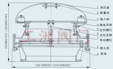 產品采用全天候密封結構,以配重來調節吸入閥瓣和泄壓蓋的開閉,以不銹鋼波紋帶為阻火層,來阻止火焰的通過,并設雙抽屜口,為清洗更換阻火層提供了方便,縮短了時間。總之,該產品具有定壓排放、定壓吸入、工閉靈活、安全阻火、結構緊湊、密封性能好、安全可靠等優點。