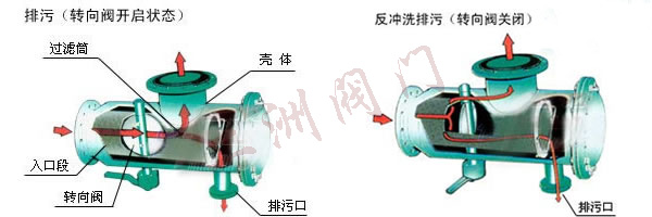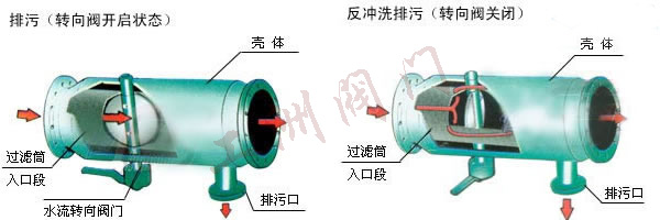 一、概述 :   P型自動反清洗排污過濾器是采用機械濾網對待處理水的顆粒SS進行分離,并依靠本身管網壓力,進行不停機自動排除污物的設備,法蘭式管道安裝。 二、應用:    P型過濾器適用于各種帶壓水系統,如工業各種潔循環、濁循環系統;各種工藝水系統;各種供水系統等,用于去除水中的各種無機雜質,確保系統和設備的可靠安全運行,特別是對需要24小時連續不停頓運行的系統尤為適宜。 三、產品特點:    1 可連續在線不間斷運行,不必設旁通回路,反沖洗時系統繼續運行不停頓;     2 過濾和反洗效果精良;     3 濾筒采用不銹鋼制造,有較強的抗腐蝕能力,使用壽命長;     4 過濾精度廣泛:         采用不銹鋼楔形條時,d=0.5-2.0mm,常規1.2mm         采用不銹鋼沖孔板時,d=2.5-4.0mm  四、技術規格:    1 P型過濾器的工作原理:    ● 正常過濾:    當過濾器需要進行正常過濾工作時,將水流導向閥處于開啟狀態,水流由入口進入過濾器,通過濾網時大量的雜質被截留在濾網內側,潔凈的水通過濾網由出口排出過濾器;     ● 反洗排污:    當過濾器需要排污清洗時,關閉水流導向閥,打開排污閥,水流由入口進入后經過水流導向閥前的濾網過濾后,一部分由過濾器的出口流出,一部分由濾網的外側經過濾網進入導向閥后的濾網內側,沖洗濾網內的雜質由排污口排除,對濾網進行了徹底的清洗,且整個清洗過程不需要系統停止運行。     ● 過濾器控制:    手動:    采用手動開啟機構,人工進行工況切換。     自動:    電動開啟機構分定時控制和壓差控制兩種方式,采用定時控制時,設有微電腦定時時控開關,可按設定時間要求實現自動清洗排污;采用壓差控制時,安裝有差壓控制器,當進出水口的壓差達到設定值(一般取為0.04MPa)時, 可實現自動清洗排污,不需要進行人工操作。此時排污口安裝電動排污閥,水流導向閥和電動排污閥實現聯動。     ● P型過濾器結構:    P型過濾器由優質的碳鋼筒體、特殊結構的不銹鋼楔形濾網、水流導向閥及排污裝置組成。所有閥門可采用手動,也可采用電動自動閥。     2 設備選型:    設備規格一般按系統管道的公稱尺寸確定,即設備的出入口公稱尺寸應和系統管道的公稱尺寸一致;規格參數表中的最大流量是按流速2.8m/s計算的,設計流量是按流速1.5m/s計算的,最大流量是指短時間內允許通過的流量。設計流量還和過濾系數有關,表中數據是按照過濾系數為3.5-4時選取的,如過濾系數減小,設計流量應降低,如過濾精度增加,設計流量可增加,但不超過最大流量值。當設備的設計流量達不到系統設計的要求時,應增大設備的規格,直至滿足為止。 五、自動沖洗排污原理:
