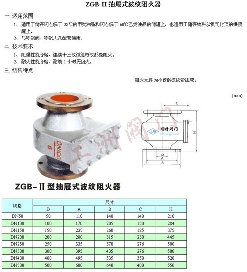 一、適用范圍:   ① 阻火器適用于儲存閃點低于28℃的甲類油品和閃點低于28℃的乙類油品,也適用于儲存物料以氮氣封頂?shù)墓绊敼奚希[石阻火器與網(wǎng)型阻火器原理同上,用在管道上。   ②與呼吸閥、呼吸人孔配套使用,也可單獨使用。 二、技術(shù)要求:   ① 阻爆性能合格,連續(xù)十三次試驗每次 都能阻火。   ② 耐火性能合格,耐燒,1小時無回火。 三、保養(yǎng)與維修: