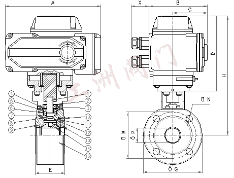 二、電動對夾式硬密封球閥尺寸表: | 直徑 | mm. | 15 | 20 | 25 | 32 | 40 | 50 | 65 | 80 | 100 |  | 尺寸 | mm. | DN15 | DN20 | DN25 | DN32 | DN40 | DN50 | DN65 | DN80 | DN100 |  | 通徑? | mm. | 15 | 20 | 25 | 32 | 40 | 50 | 65 | 80 | 100 |  | A | mm. | 207,5 | 207,5 | 207,5 | 207,5 | 256,5 | 256,5 | 256,5 | 256,5 | 381 |  | B | mm. | 122,5 | 122,5 | 122,5 | 122,5 | 156,5 | 156,5 | 156,5 | 156,5 | 242 |  | C | mm. | 68 | 68 | 68 | 68 | 94 | 94 | 94 | 94 | 137 |  | D | mm. | 163,5 | 163,5 | 163,5 | 163,5 | 185 | 185 | 185 | 185 | 234 |  | X | mm. | 44 | 44 | 44 | 44 | 44 | 44 | 44 | 44 | 44 |  | E | mm. | 35 | 38 | 42 | 50 | 60 | 70 | 95 | 118 | 140 |  | ΦG | mm. | 90 | 100 | 110 | 130 | 140 | 165 | 185 | 200 | 220 |  | ΦM | mm. | 65 | 75 | 85 | 100 | 110 | 125 | 145 | 160 | 180 |  | ΦN | mm. | M 12/4 | M 12/4 | M 12/4 | M 16/4 | M 16/4 | M 16/4 | M 16/4 | M 16/8 | M 16/8 |  | ΦR | GAS | 1/8" | 1/8" | 1/8" | 1/8" | 1/8" | 1/8" | 1/8" | 1/8" | 1/8" |  | T. of cycle 50/60 Hz | s. | 15 - 12,5 | 15 - 12,5 | 15 - 12,5 | 15 - 12,5 | 15 - 12,5 | 15 - 12,5 | 15 - 12,5 | 15 - 12,5 | 15 - 12,5 |  | H | mm. | 234,5 | 237,5 | 243 | 249,5 | 295 | 302 | 325 | 335 | 395 |  | 重量 | Kg. | 6,7 | 7,3 | 7,9 | 9,3 | 15,4 | 15 | 19,7 | 29,3 | 44,9 |