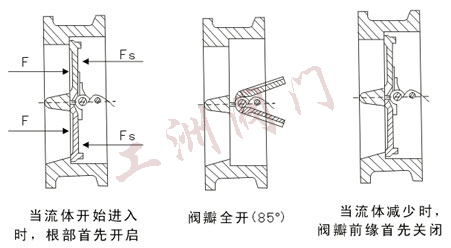 一、產品特點: ??? H76型止回閥創新的雙閥瓣結構采用兩個彈簧負載閥瓣(半閥瓣),懸掛在中心垂直的鉸鏈銷釘上。當流體開始流動時,閥瓣在作用于密封表面中心的合力(F)作用下開啟。起著反作用的彈簧支撐力(Fs)的作用點位于閥瓣面中心外的位置,使得閥瓣根部首先開啟。從而有效避免了舊型常規閥門在閥瓣開啟時所出現的密封表面摩擦現象。 當流速減緩,扭轉彈簧自動反作用,使得閥瓣關閉,向閥體閥座靠近,減少了關閉的行程距離和時間。當流體倒流時,閥瓣逐漸靠近閥體閥座,閥門的動態反應隨之大大加速。這就戲劇性地減小了水錘現象的影響,從而實現無撞擊性能。  在關閉時,彈簧力作用點的作用使得閥瓣頂端首先關閉。這就防止了閥瓣根部的出現咬磨現象,使的閥門能夠保持更長時間的密封的整體性。