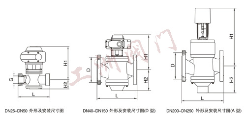 產品型號  | 閥門形式  | 規格  | 外形及安裝尺寸 (mm)  |  L  | H1  | H2  | D(φ)法蘭  | G螺紋  |  A/D-EDRV1  | 二通 絲口  | DN25  | 160  | 265  | 70  |  | G1  |  A/D-EDRV2  | DN32  | 180  | 275  | 70  |  | G1-1/4  |  A/D-EDRV3  | DN40  | 300  | 290  | 90  |  | G1-1/2  |  A/D-EDRV4  | DN50  | 300  | 290  | 90  |  | G2  |  A/D-EDRV5  | 二通 法蘭  | DN32  | 160  | 220  | 70  | 1OO  |  |  A/D-EDRV6  | DN40  | 200  | 235  | 110  | 110  |  |  A/D-EDRV7  | DN50  | 215  | 230  | 115  | 125  |  |  A/D-EDRV8  | DN65  | 230  | 238  | 120  | 145  |  |  A/D-EDRV9  | DN80  | 275  | 275  | 146  | 160  |  |  A/D-EDRV10  | DNl00  | 290  | 295  | 165  | 180  |  |  A/D-EDRV11  | DNl25  | 315  | 307  | 208  | 21O  |  |  A/D-EDRV12  | DNl50  | 350  | 326  | 205  | 240  |  |  A/D-EDRV13  | DN200  | 430  | 715  | 295  | 295  |  |  A/D-EDRV14  | DN250  | 520  | 740  | 345  | 355  |